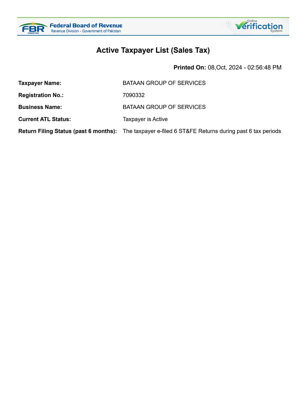 FBR Active Taxpayer Status - Sales Tax
