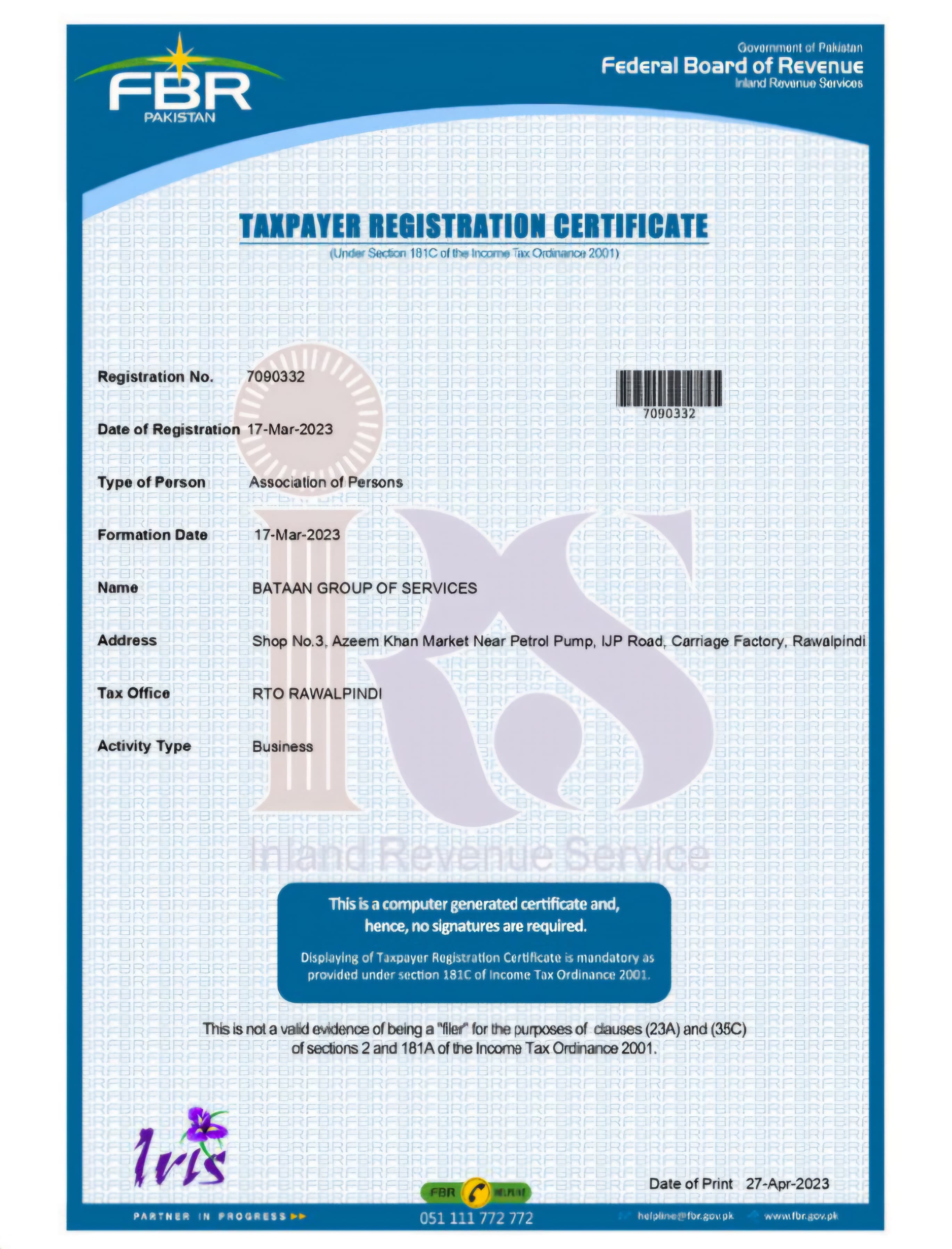 FBR Taxpayer Registration Certificate