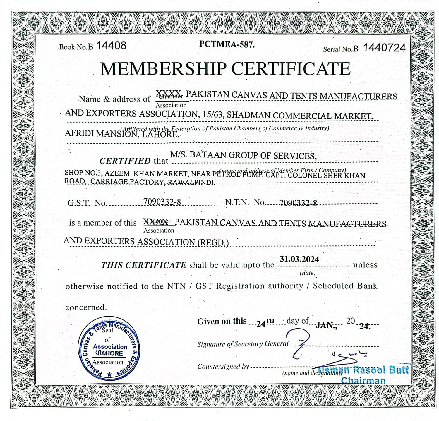 Membership with Pakistan Canvas and Tents Manufacturers and Exporters Association