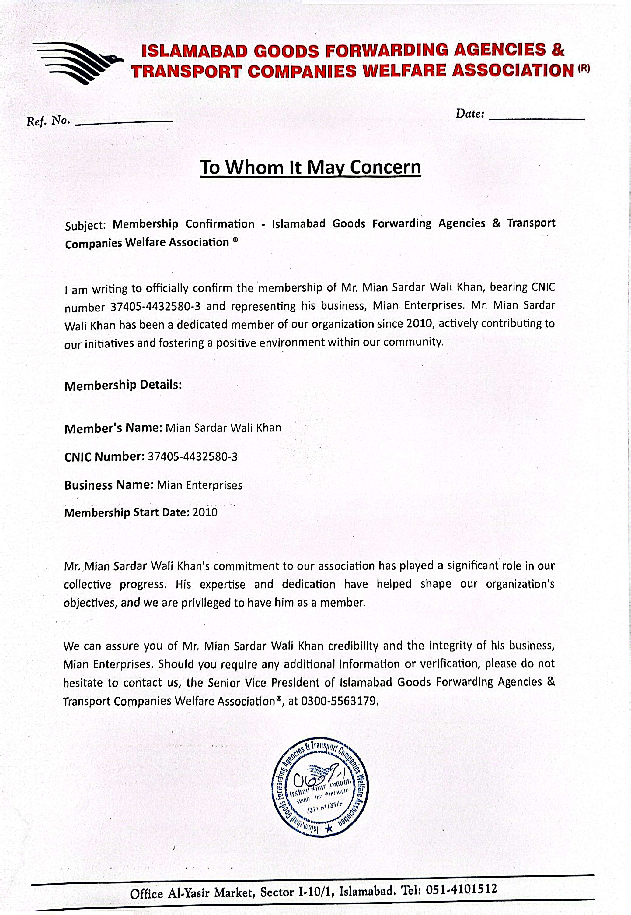 Membership With Islamabad Goods Forwarding Agencies & Transport Companies Walfare Association (R)