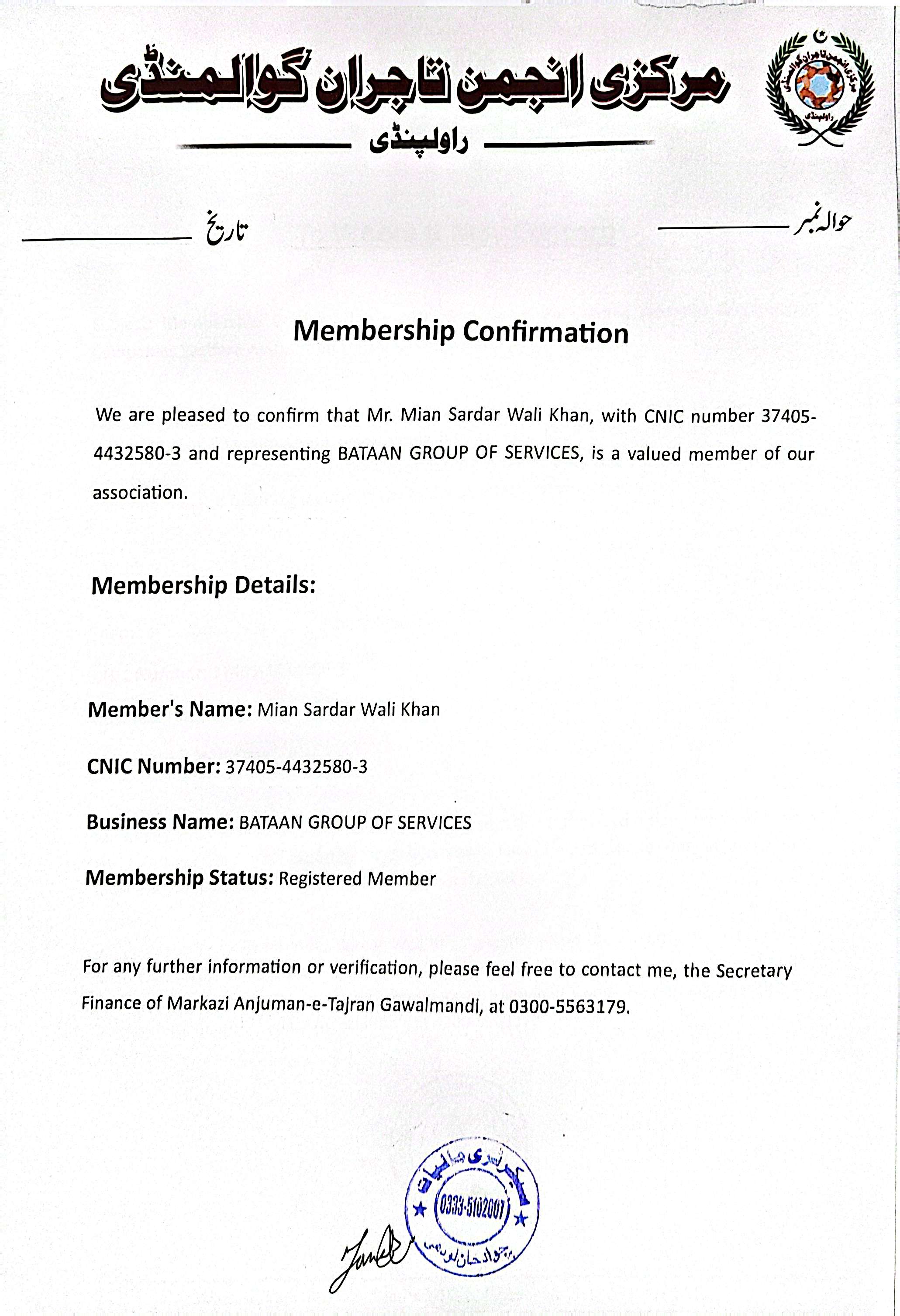 Membership with Markazi Anjuman-e-Tajran Gawalmandi, Rawalpindi