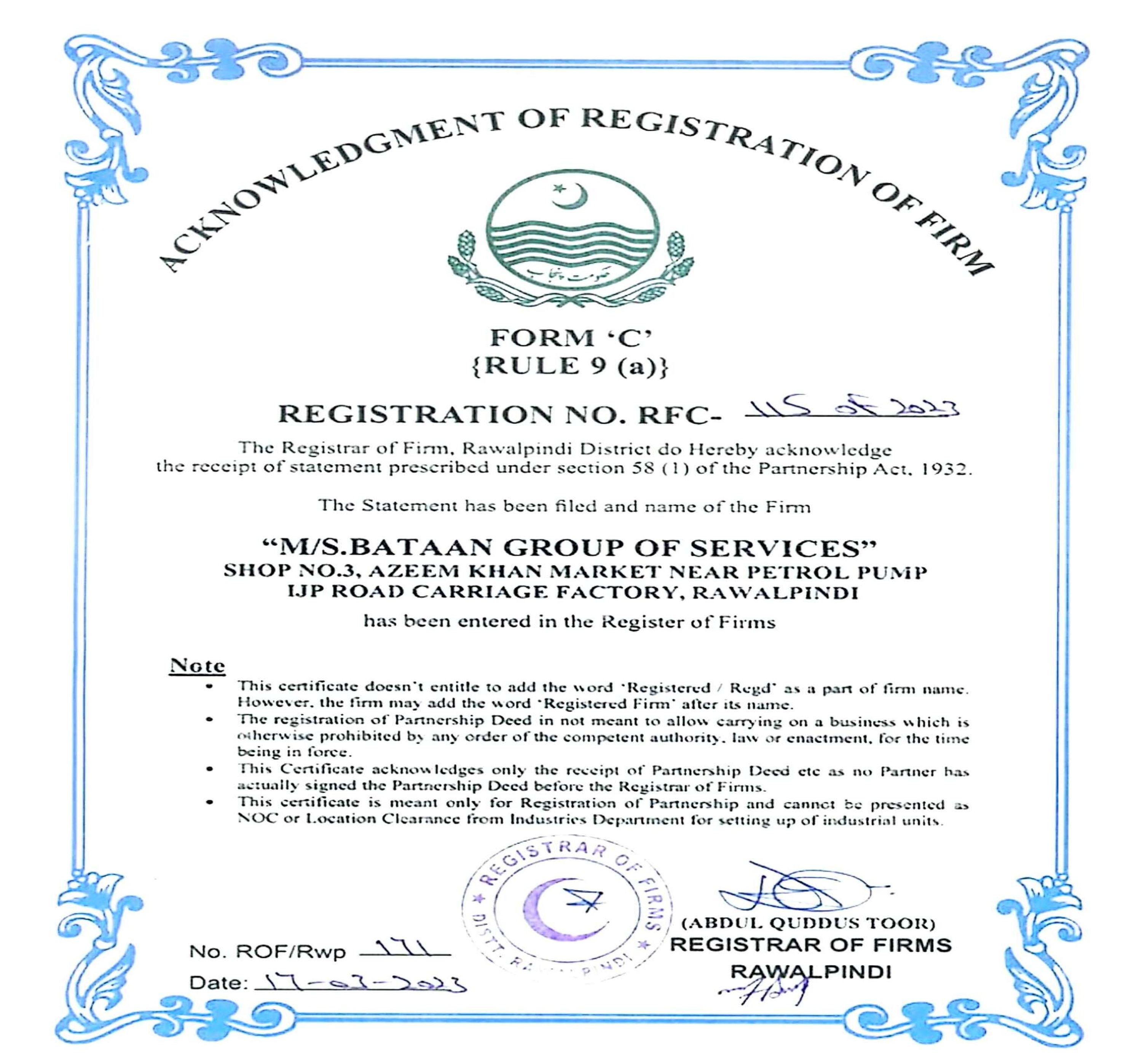 Registration with Registrar of Firms, Rawalpindi (Government of Punjab)